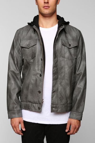 "Gnarly trucker jacket from Charles & 1/2. Sleek faux leather construction topped with a hidden zip-up closure and a button-down front placket. Complete with a jersey hood, pointed collar and flap chest pockets. Finished with front slit pockets and cinch waist tabs for a perfect fit. UO Exclusive.CONTENT + CARE- Cotton, polyester, polyurethane - Machine wash- ImportedSIZE + FIT- Model is 6'1" and wearing size Medium- Measurements taken from size Medium- Chest: 22.5"- Length: 26.5"Please see the California Proposition 65 Warning regarding this product here.,GREY,S" Read more