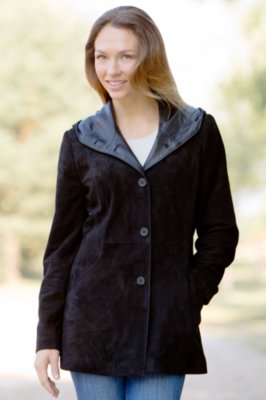 The Melrose will spend very little time hanging in your closet, if you see what we mean. Our Italian lamb suede jacket is crafted with circular stitching at the sides, a tapered waist, and a gentle flare to the hem, creating a flattering silhouette that looks superb over jeans or skirts. The plush lamb suede is accented by smooth lambskin leather for a rich contrast that trims the front pockets and lines the inside placket and cozy hood. Wear the hood up for warmth or down like a collar with the smooth lovely nappa leather showing. This button-front suede coat is poised to make you happy, day after day. Acetate lining. 28" long. Made in Canada. Read more
